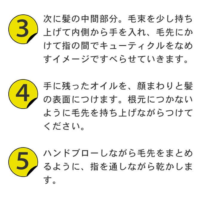 - タオルドライ後、適量を手に取り、中間~毛先に指を通しながら塗布します。