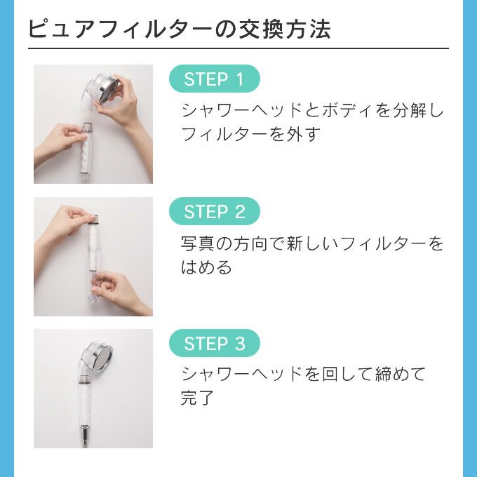 香りを感じビタミンで塩素除去できるビタフィルター、不純物除去を除去するピュアフィルター。