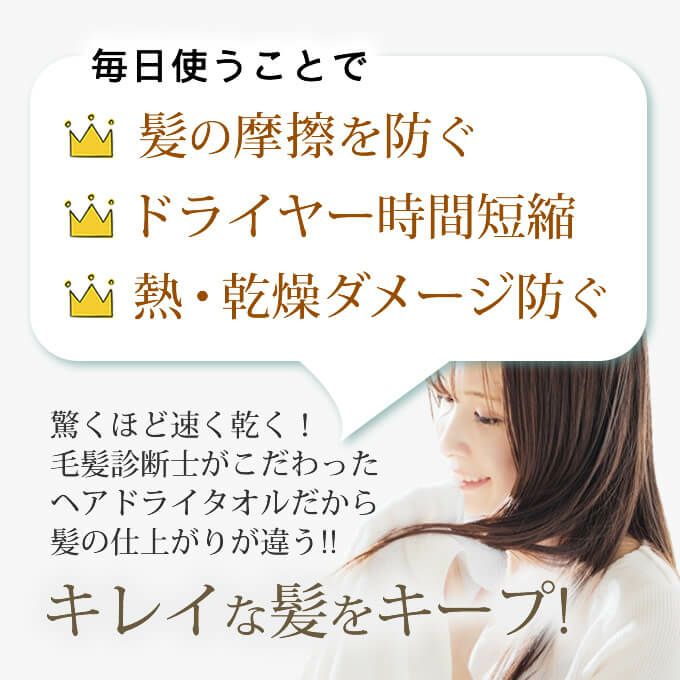 優れた吸水力・吸水スピードで、ドライヤーの時短を叶え、髪への負担を最小限に抑えます。