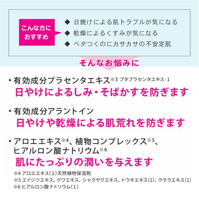 薬用美白成分のプラセンタリキッドが、メラニンの生成を抑え、日やけによるシミ・ソバカスを防ぎます。