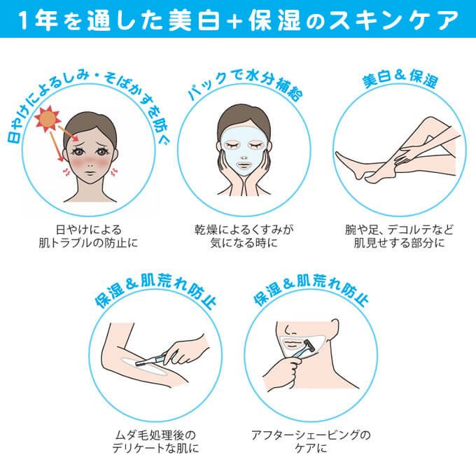 顔はもちろん、シミ・ソバカスが気になる腕やデコルテなど全身の美白ケアにたっぷりお使いいただけます。