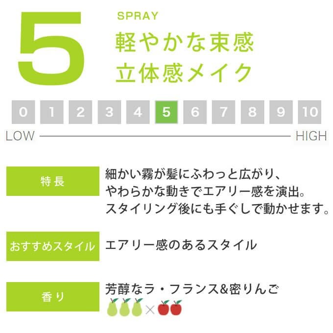 ご使用前によく振ってから、髪の内側から吹き込むようにスプレーし、手ぐしや指先で束感や毛流れをつくります。