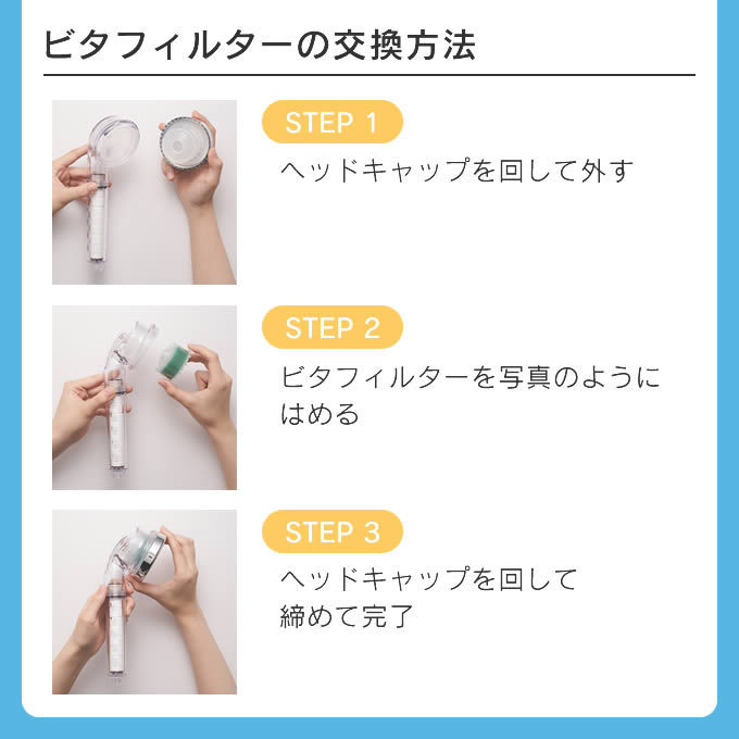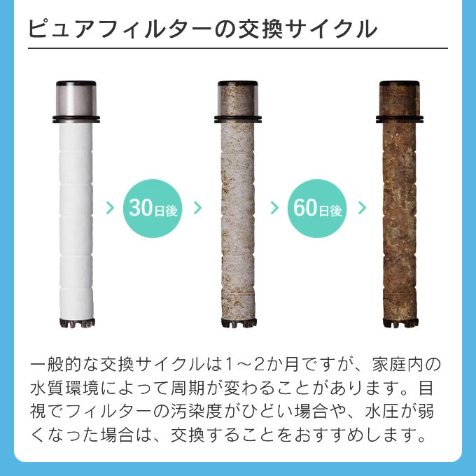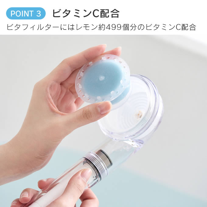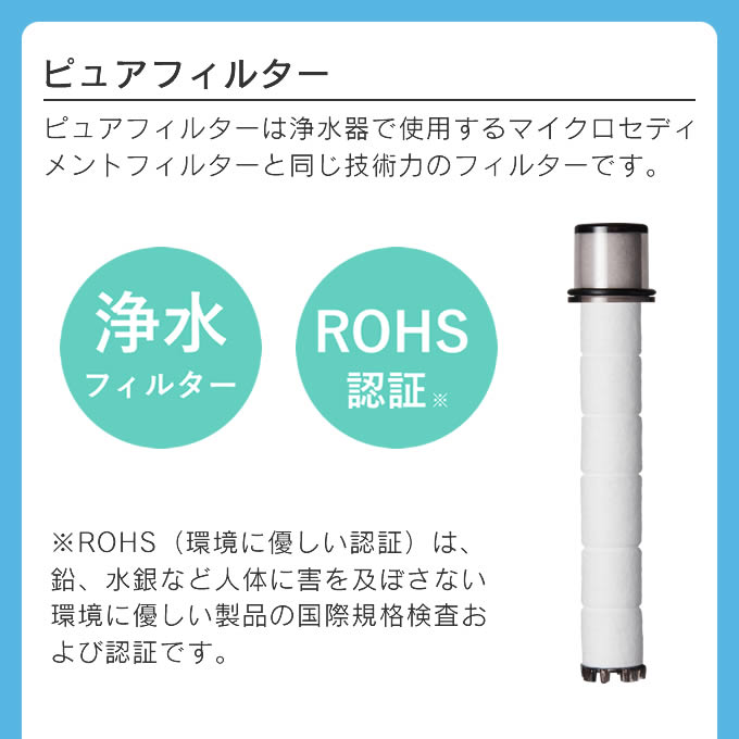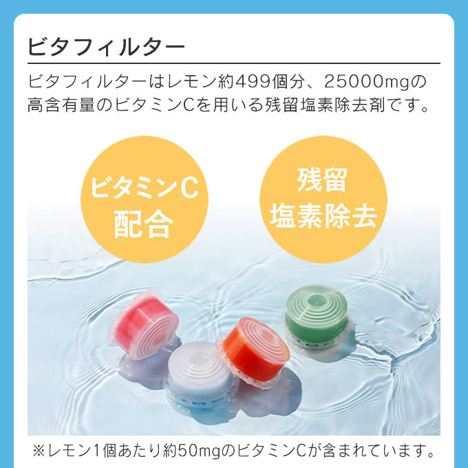 香りを感じビタミンで塩素除去できるビタフィルター、不純物除去を除去するピュアフィルター。