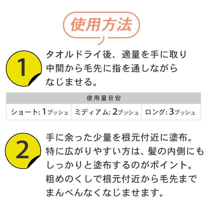 使用量目安:ショート/1プッシュ、ミディアム/2プッシュ、ロング/3プッシュ