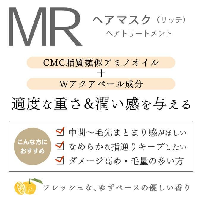 適度な重さと潤い感を与え、中間~毛先のまとまり感となめらかな指どおりのキープを目的としたトリートメント。