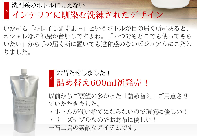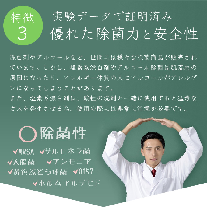 配合成分のミネラルと植物抽出物は洗浄性能以外に除菌性能も持ち合わせています。