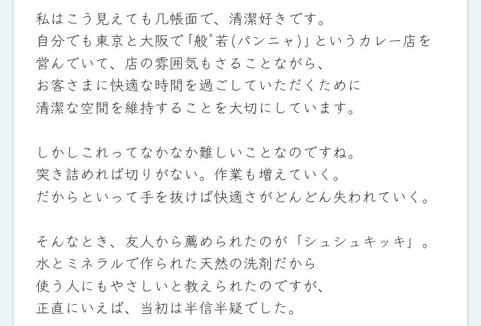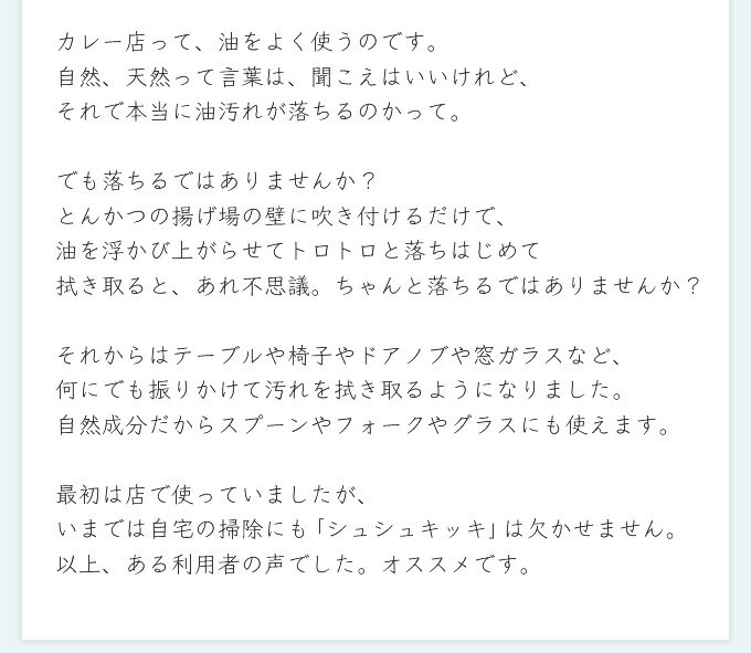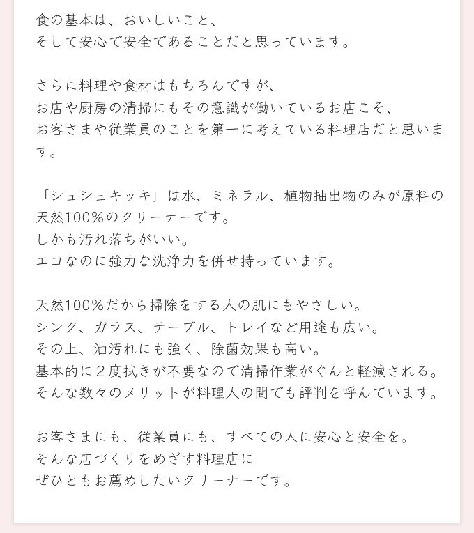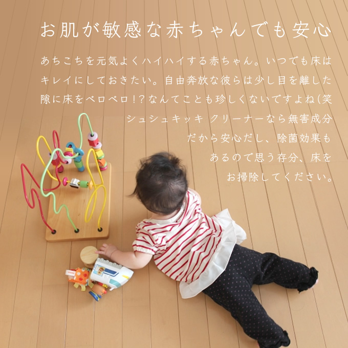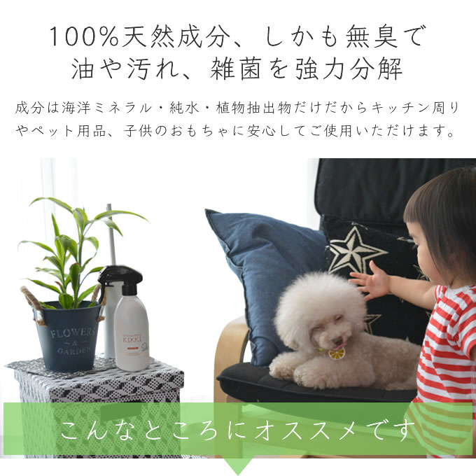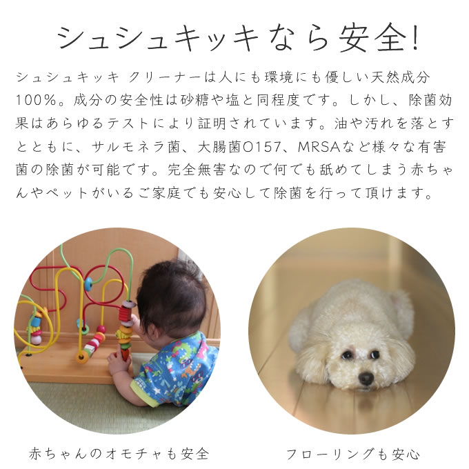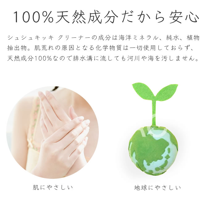 シュシュキッキ・クリーナーは汚れを剥離し分解する作用があり、また天然のミネラルが原料ですので人にも環境にも安心です。
