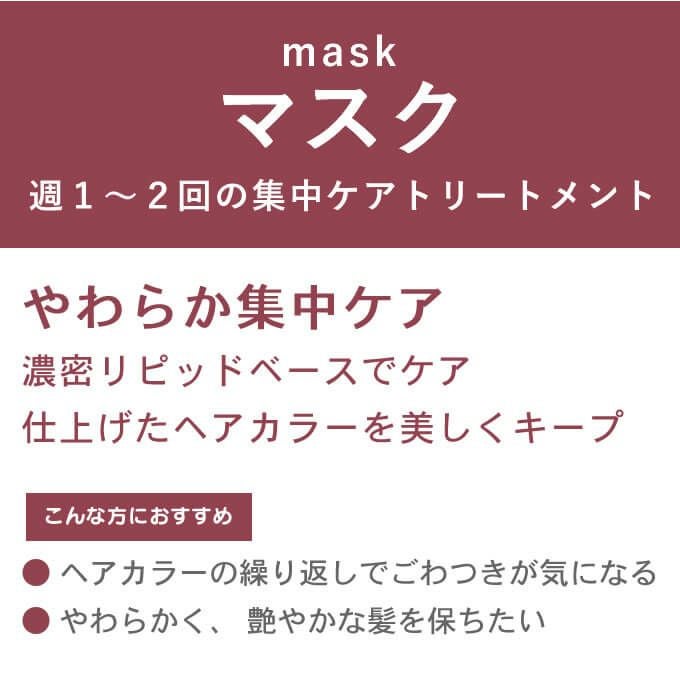 ・日々受けるダメージによりごわつきがちなカラードヘアを、12種類の植物由来オイルをはじめとする濃密リピッドベースが髪の内、外に働きかけ、やわらかくつややかに整えます。
