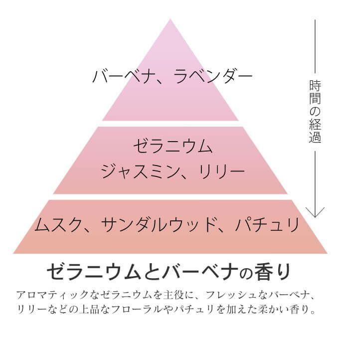 アロマティックなゼラニウムを主役に、フレッシュなバーベナ、リリーなどの上品なフローラルやパチュリを加えたやわらかい香りです。