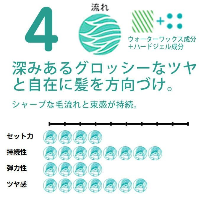 ウォーターワックス成分は自在に髪を動かしやすく、シャープな毛流れとグロッシーな質感を表現。