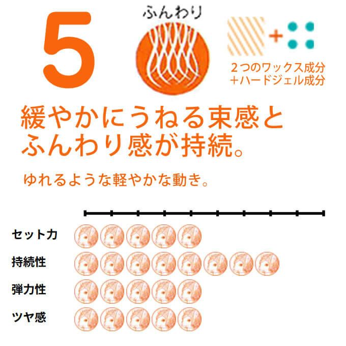 ハードなワックス成分と柔軟さを与えるワックス成分を組み合わせ、ふんわりとしたフォルムに穏やかにうねる束感を表現。