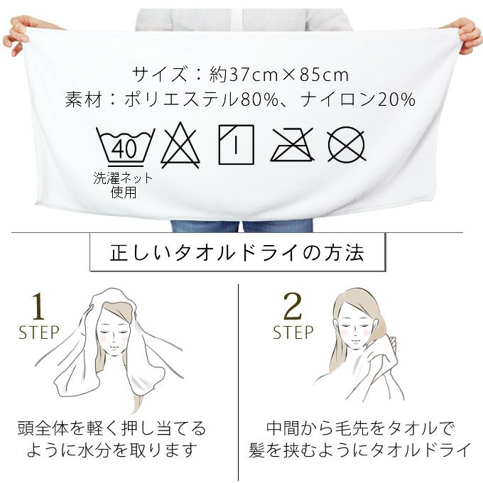 - タオルで髪を包み込み、軽くおさえるようにして拭いてください。